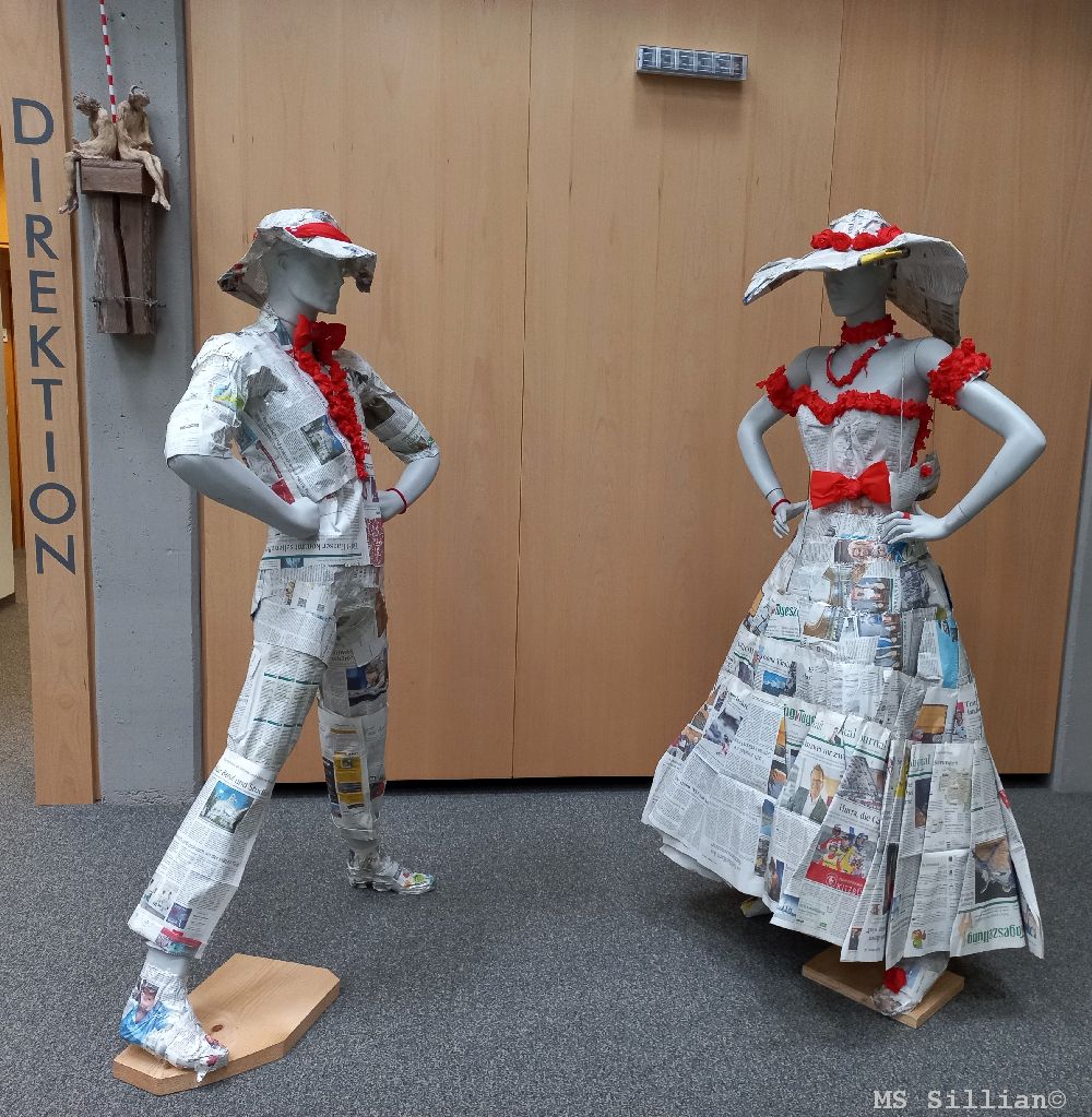 Im textilen Werkunterricht setzten sich die Schülerinnen der 4. Klassen der MS Sillian mit dem Thema Mode- und Bekleidungstechnik auseinander. Im Zuge dessen entstanden kreative, gut durchdachte „Kleidungsstücke aus Zeitungspapier“, die an Schaufensterpuppen angebracht wurden. Zudem, wie man an den Bildern erkennen kann, tragen die Puppen auch ziemlich raffinierte Accessoires.