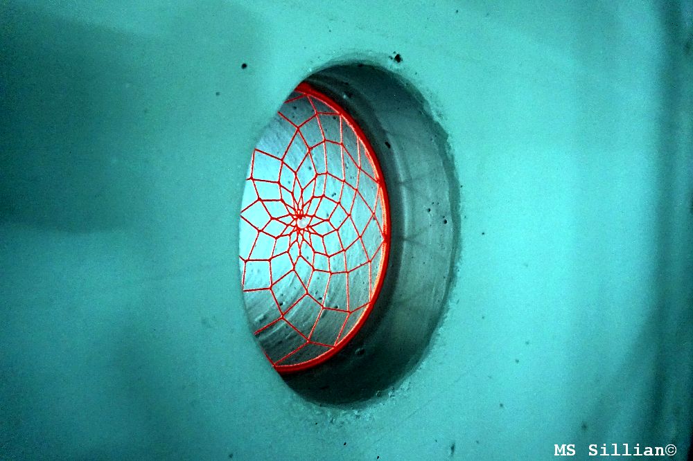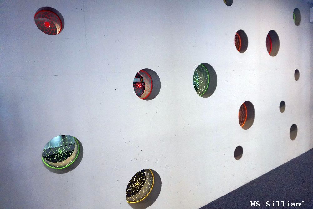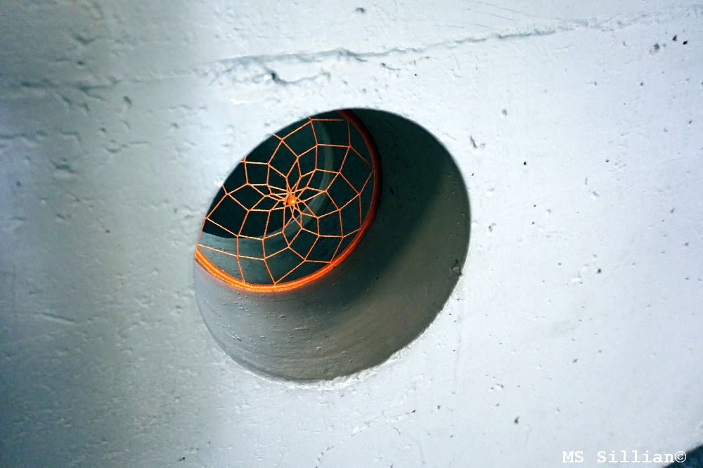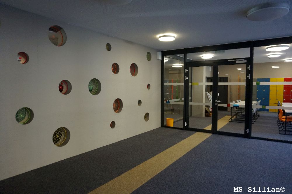 Eine Betonwand, die mit verschieden großen Löchern versehen ist, war Inspiration für eine gestalterische Optimierung. Spinnennetze in unterschiedlichen Farben lassen nun die Wand freundlicher erscheinen. Sie sollen ein Zeichen dafür sein, was eine Schule für alle sein kann, nämlich: ein Ort der Begegnungen, der sozialen Kontakte, ein Ort der Vernetzungen, der Zusammengehörigkeit, ein Ort des Lernens und des Wachsens.