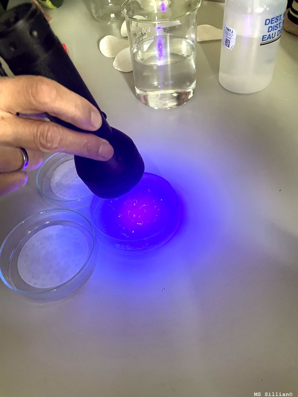 Im praktischen Teil konnten die Schüler*innen beobachten, wie beim Waschen von Polyesterkleidung Mikroplastikfasern ins Abwasser gelangen. Diese wurden gefiltert und mit einer UV-Lampe sichtbar gemacht – ein eindrucksvoller Beweis für die unsichtbare Verschmutzung durch Mikroplastik.