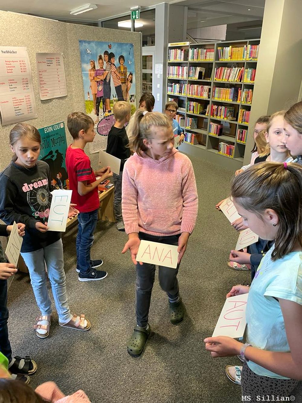 Damit sie die Bücherei gleich nützen können, bekamen die Kinder der ersten Klassen bereits in der 2. Schulwoche eine 2-stündige Einführung in unsere Schulbibliothek. Auf spielerische Art übte sie das Alphabet, lernten die Systematik kennen und wurden über den Verleihmodus aufgeklärt. Nun finden sie sich schon recht gut zurecht, wenn sie den Auftrag erhalten, ein bestimmtes Buch ausfindig zu machen oder richtig einzuordnen.
