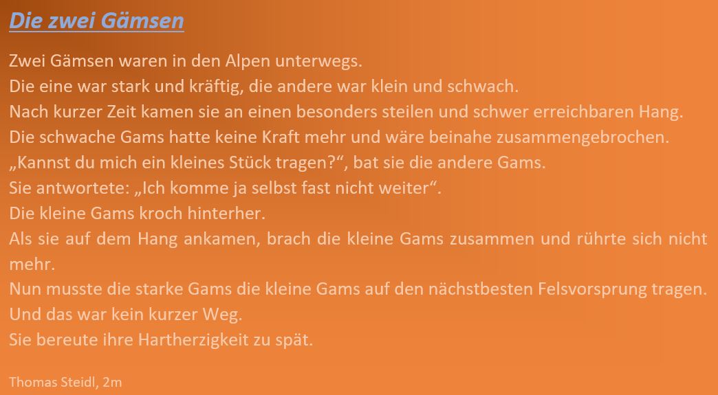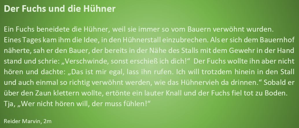 In einem weiteren Schritt haben wir die Zeit des Lockdowns dazu genützt, uns beim Schreiben von eigenen Fabeln auszuprobieren oder Fabeln umzuschreiben. Einige Ergebnisse könnt ihr hier lesen. Viel Spaß dabei wünschen euch die 2m-Klasse!