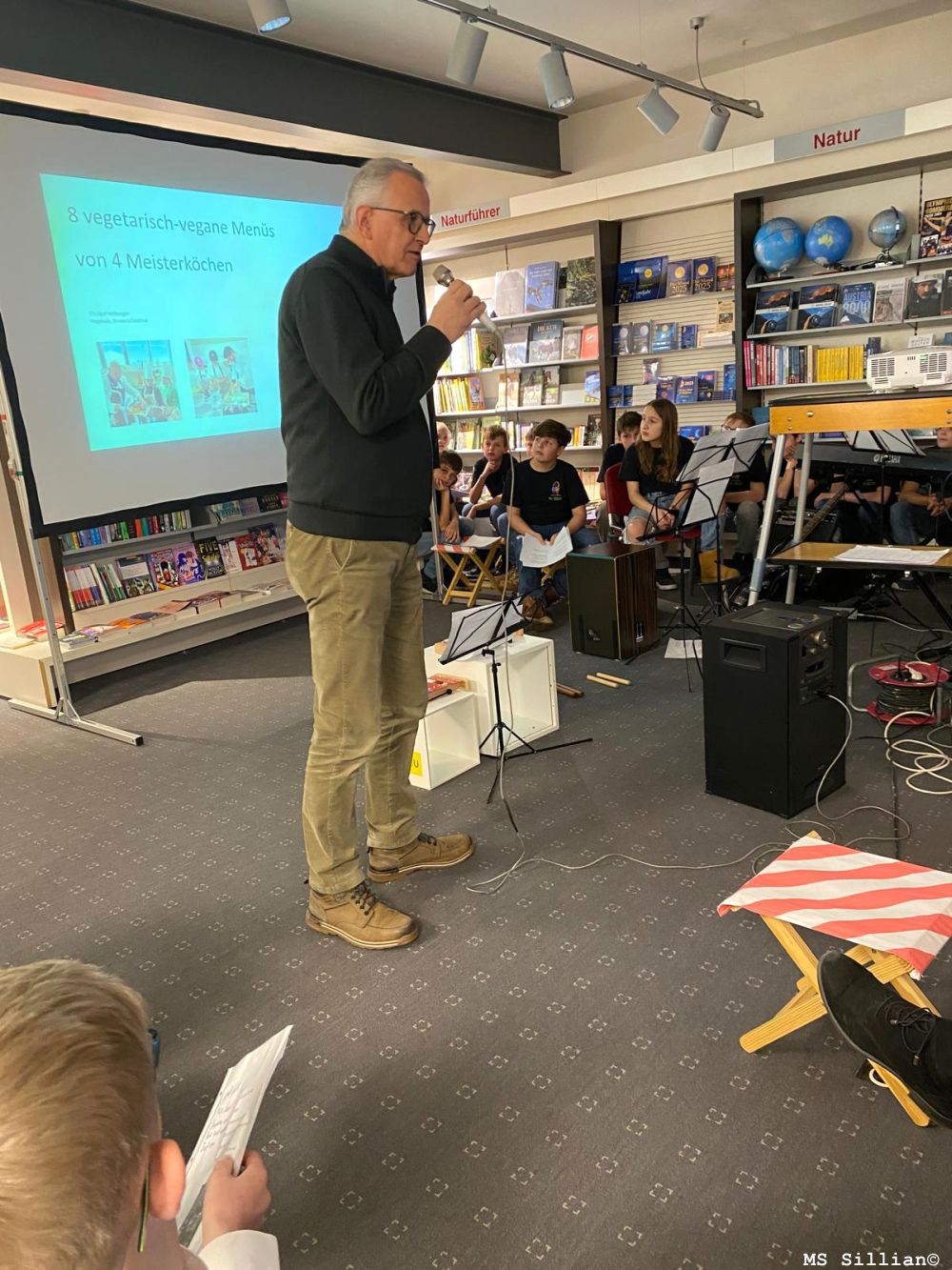 In der Tyrolia in Lienz lasen 6 Schüler/-innen ihre Texte und die von Kollegen/-innen vor. Die 2m mit ihrer Lehrerin Karin Schneider interpretierte sehr gekonnt 3 Lieder von Max Raabe und für die Kulinarik sorgte die 3m mit ihrer Lehrerin Sabrina Fuchs mit feinen Sternenbrötchen.