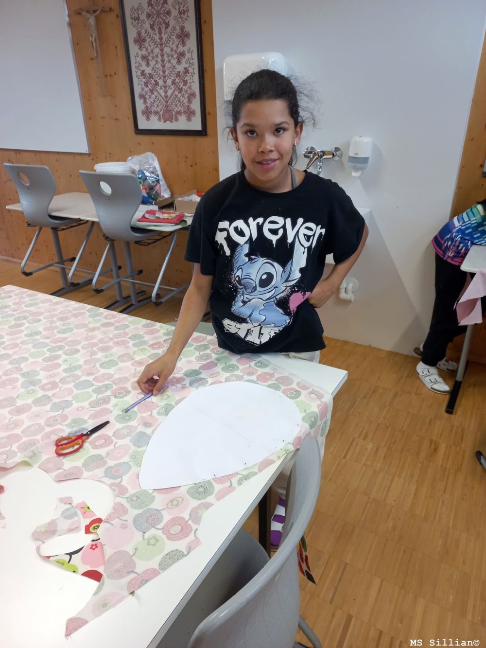 Eifrig wurde an individuellen Modellen/Schnittmustern gearbeitet. Jedes Kind übertrug seine entwickelte Schnittvorlage auf den Stoff. Dabei wurden auch einige Begriffe, die es beim Nähen braucht, erklärt und angewendet (Nahtzugabe, Heftfaden, usw.) An der Nähmaschine waren verschiedene Sticharten notwendig, um einer „industriellen Anfertigung“ näher zu kommen. Das Kissen wurde mit dem Naturprodukt „Dinkelpilz“ gefüllt. Somit erfüllt dieses Produkt auch den gesundheitlichen Aspekt.