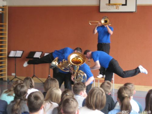 Am 06.04. hat das Ensemble “PER SONARE” unter der Leitung von Jo Mair im Rahmen der Veranstaltungsreihe des TKS (Tiroler Kultur Service) unsere Schule besucht. Alle Musikschwerpunktklassen erfuhren geschichtliche und technische Details zu den Blechblasinstrumenten. In humorvoller Weise präsentierten die Akteure Klangproben aus mehreren Epochen, Popsongs und sogar Ballettmusik mit Tanzeinlagen kamen zur Aufführung. Für die aufmerksame Zuhörerschaft war es ein unvergesslicher Ohrenschmaus. Vielen Dank!