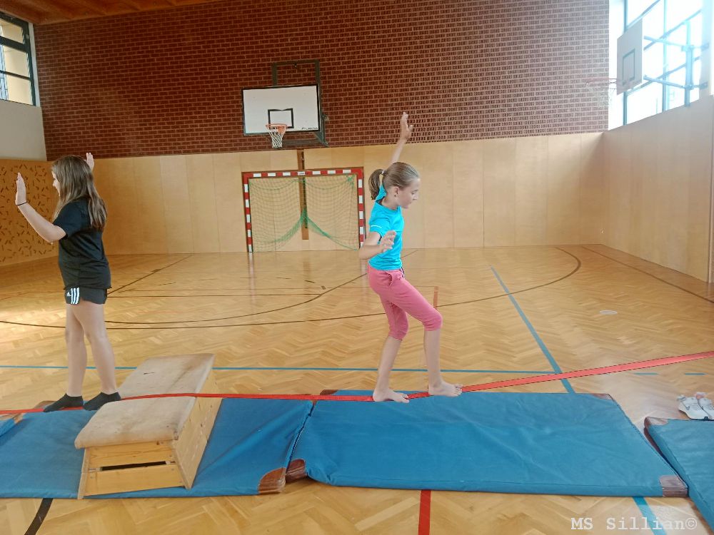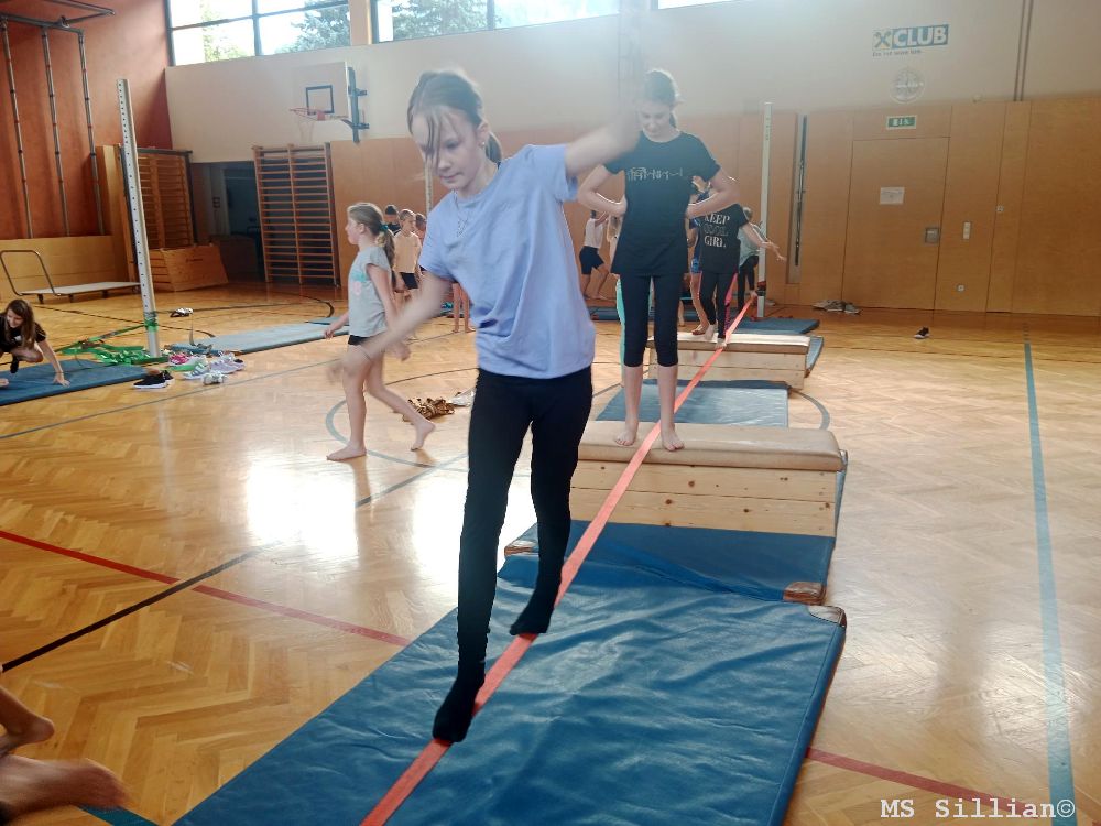 Unter der Anleitung von Profi-Slacklinerin Katharina Ortner aus Sillian konnten die SchülerInnen erste Erfahrungen in dieser Sportart erleben. Beim Slacklinen balanciert man auf einem Band, das zwischen zwei Fixpunkten (meistens Bäume) gespannt ist.