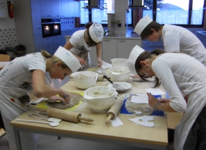 An zwei Nachmittagen wurden die einzelnen Teilarbeiten, vom Teigkneten, über das Ausschneiden, Backen und Zusammensetzen, bis hin zum individuellen Verzieren der Häuser, mit viel Eifer und Engagement ausgeführt.