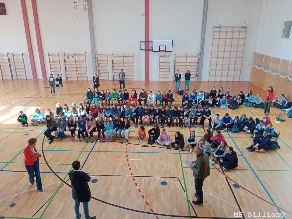 Am Anfang wurden wir in Gruppen, mit verschiedenen Schülerinnen und Schülern  von Toblach und  Kitzbühel, eingeteilt und uns wurde  der Ablauf des Tages erklärt. Danach bekamen wir einen Krapfen, der sehr lecker schmeckte!