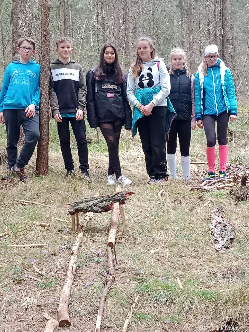 Am Nachmittag machten wir uns alle wieder, eingeteilt in unseren Gruppen vom Vormittag, auf den Weg in den Wald. Dort hatten wir dann eine Stunde Zeit, um eine Kegelbahn zu bauen. Für die Kegelbahn durften wir aber nur sämtliche Materialien des Waldes verwenden z.B. Äste, Moos, Rinde, Steine…